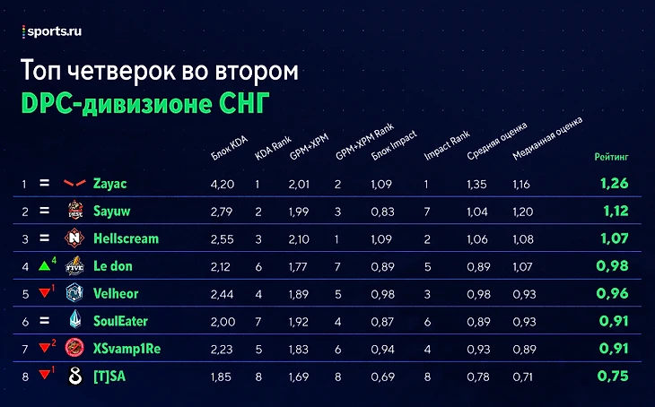 Картина в лучшей лиге мира начинает проясняться: HR со статой 5-0 почти гарантировали себе выход, а NoTechies и Trident Clan с 1 победной серией на двоих увязли в зоне вылета. Главная интрига – кто возьмет вторую путевку в высший дивизион. Поскольку все 5 оставшихся команд проиграли ровно по 2 матча, шансы выглядят равными. Перед последним полноценным туром давайте оценим, как в целом изменилась индивидуальная статистика игроков.