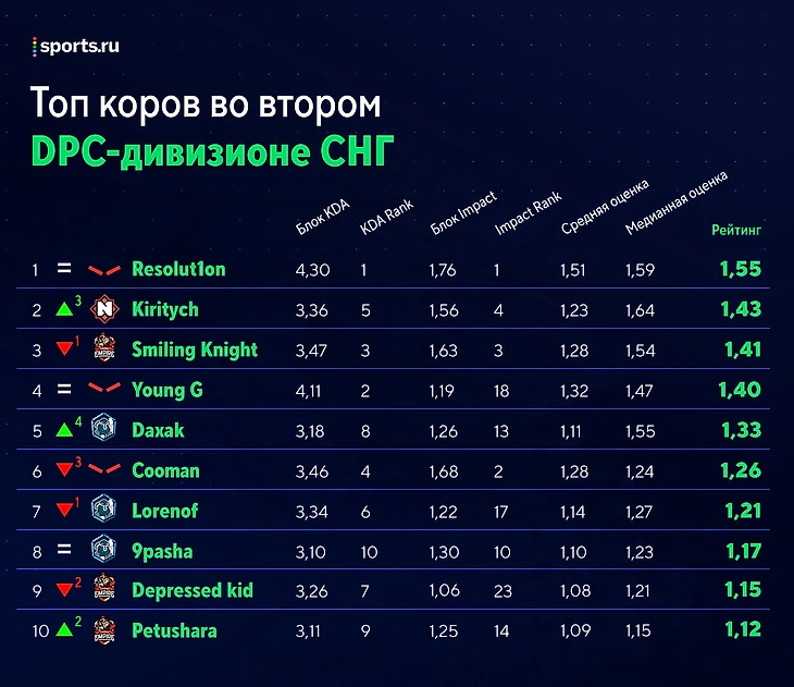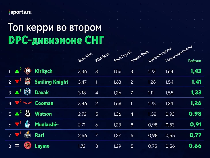 – Layme занимает последнюю строчку среди коров, DkFogas и Dame – 5-ю и 10-ю с конца соответственно. У NoTechies самые слабые коры в лиге: с суммой рейтингов 2,21 они отстают и от F5 с 2,28, и от TC с 2,37.