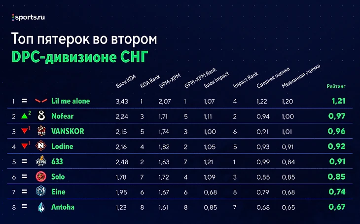 Тем не менее дела у состава налаживаются: Limitless прорвался в верхнюю половину таблицы оффлейнеров, Dendi поднялся в топ-4 мидеров и остановился на 11-м месте среди коров, а Nofear и вовсе вошел в шестерку лучших саппортов. И главное, что впереди матчи с F5, Тридент Кланом и Немигой, из которых только последняя выше B8.