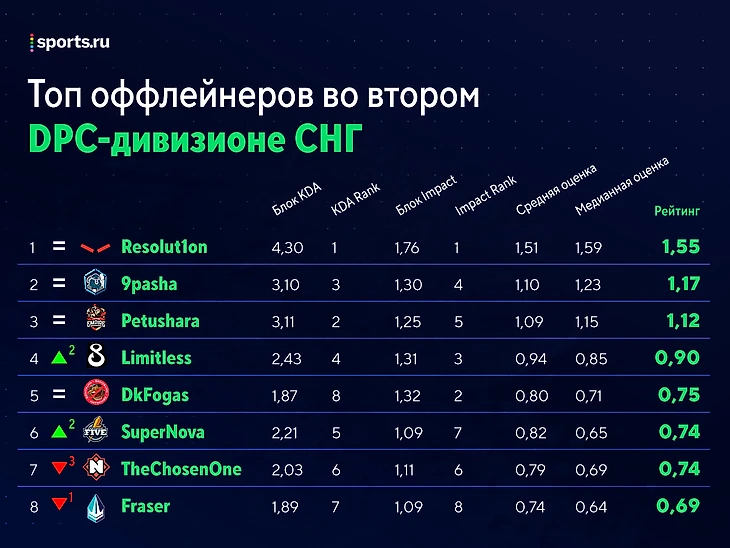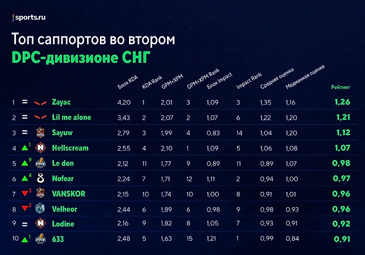 – Solo и XSvamp1Re располагаются на 4-й и 5-й с конца позициях соответственно в списке саппортов. Здесь по сумме индексов игроки NT пятые: с 1,76 опережают B8 (1,72), Prosti Esli (1,70) и Trident Clan (1,58). Тем не менее отрыв даже в 0,18 нельзя назвать существенным.
