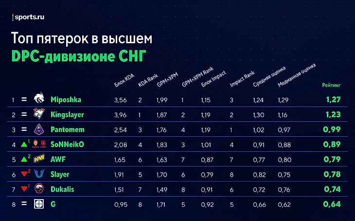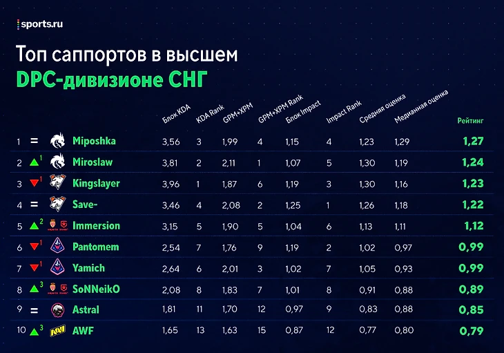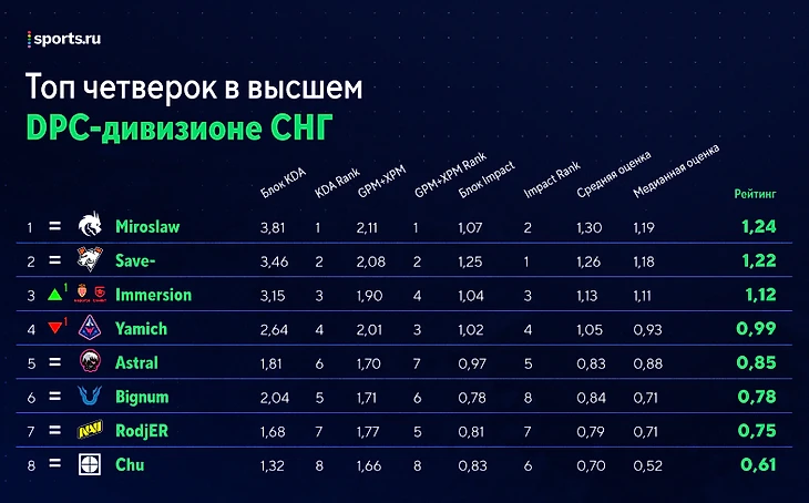 ★ Разочарование раунда - Winstrike. После 0:2 от NAVI команда Ямича почти обнулила свои шансы на мейджор (впереди еще матч с VP) и включилась в борьбу за выживание. Победа над PuckChamp спасет Пантомема и компанию, но после крутого начала чемпионата и очень близкой серии со Spirit многие поверили в Winstrike. К сожалению, стагнация по рейтингам продолжается третий тур подряд: -0,23 у Дурачье, -0,17 у Рейбла, -0,05 у Чешира, -0,01 у Ямича и -0,15 у Пантомема. Причем если оффлейнеру и саппортам удалось остаться на схожих позициях в наших таблицах, а Re1bl вообще ничего не потерял, то DyrachYO рухнул во вторую половину списка керри и на 13-ю строчку среди коров. Пока Winstrike по-прежнему третьи по сумме рейтингов, но, кажется, это ненадолго – Gambit и NAVI совсем рядом, а расписание у состава Ямича не самое простое.