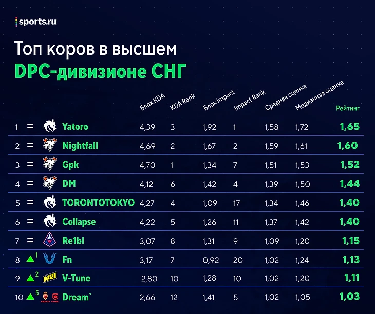 ★ Прогресс тура – Gambit. «Монако» поднялась на 4-е место благодаря отличной игре Дрима, Иммершна и Соннейко. Саппорты подняли свои рейтинги на 0,12 и 0,13 соответственно и закрепились в общей топ-10. Немного ухудшилось положение Нуна: 10-я позиция в списке коров и показатель 1,03 тур назад превратились в 11-ю строчку и индекс 1,02 сейчас. Зато оцените рывок Дрима: +0,29 к рейтингу за неделю и врыв в топ-10 коров, а также верхнюю половину таблицы керри! Похоже, состав SoNNeikO оправился от тяжелого старта и больше не намерен отдавать очки.