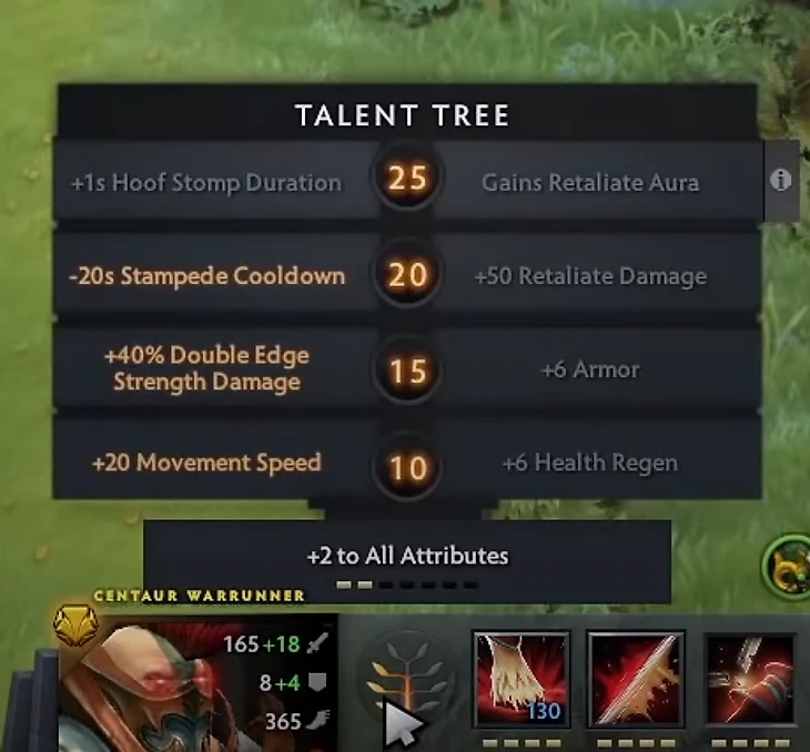 На первом уровне берется стан, контестить крипа-дальника. Максим Обратку, на четвертом берем Double Edge. С макшеной пассивкой и Вангардом Кентавр забирает за Т1 башней пачки крипов и фармит их на лесных спотах.
