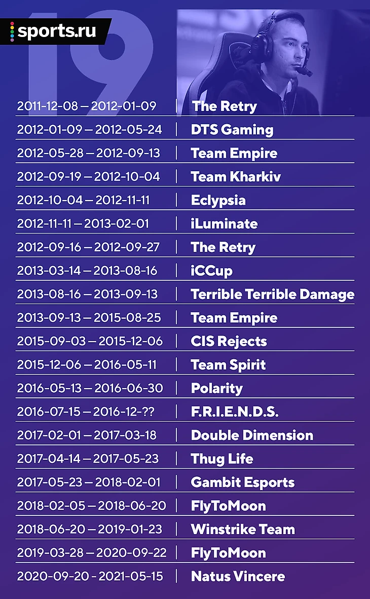 19 – уже устоявшийся мем, который вы могли видеть, например, в комментариях о переходе Соннейко в NAVI. Именно столько раз Флая кикали (а еще несколько раз он переходил из клуба в клуб всем составом). Карьера Флая в одной картинке: