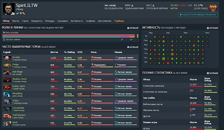 Игорь «ILTW» Филатов cыграл больше 20 000 пабликов на основном аккаунте. Учитывая, что в среднем матч в Доте длиться 30-50 минут (возьмем 40), то наш герой наиграл более 800 000 минут, что в часах составляет более 13 333.