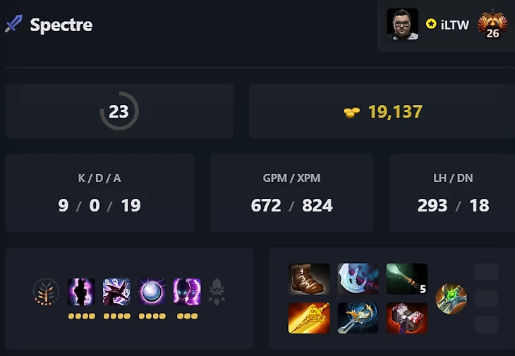 Здесь разобраться в нюансах итембилда чуть сложнее, поэтому пойдем издалека. Перед нами обычная Spectre, вот только первым артефактом после сапога она берет Саблю.