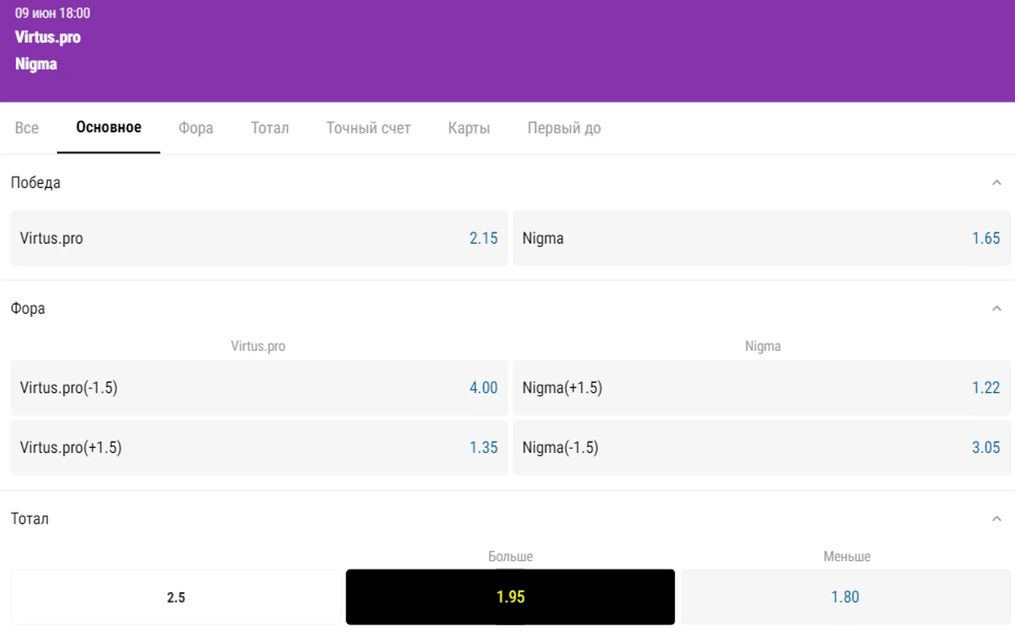 Virtus.pro – Nigma. Тотал карт (2,5+) за 1,95