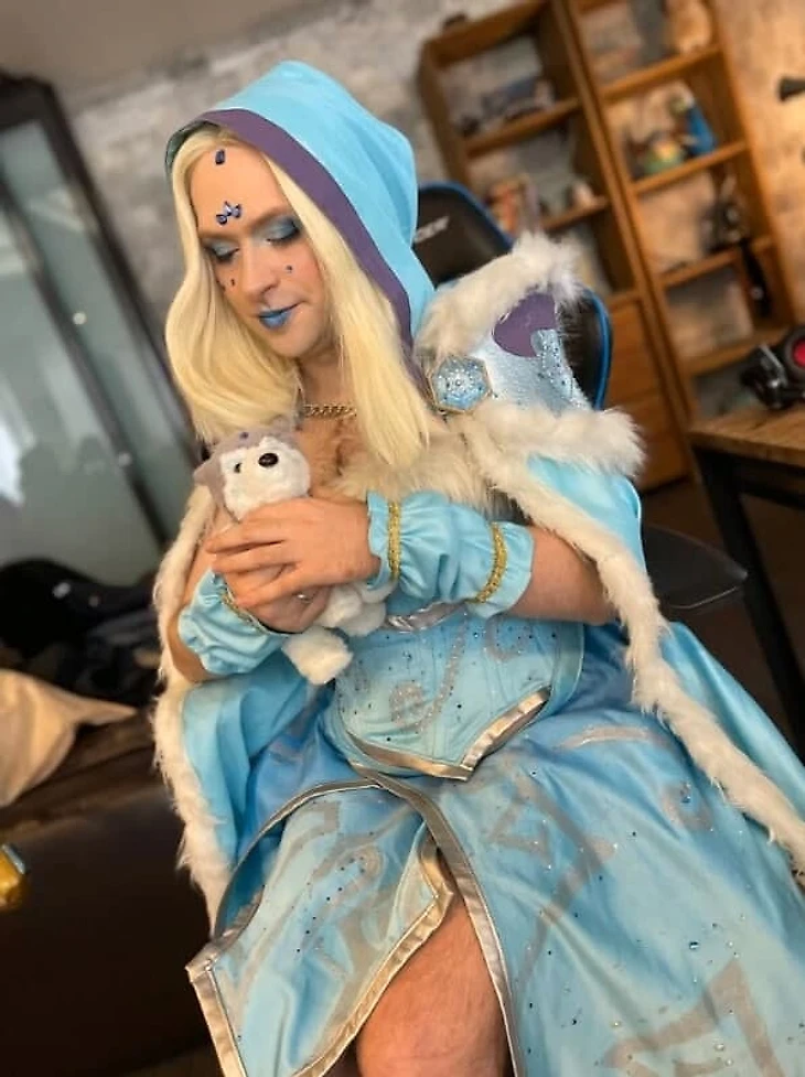 «Это сигнатурка еще с первой «Доты». Я очень полюбил этого героя, практически впитал ее. Поэтому мы с ней слились. На мне корсет еле сошелся. Ну, подкачалась Maiden в лесу, туда-сюда. Не тощая. Я стал лишний раз уважать косплеерш. В этом даже сидеть тяжело, а если я сейчас хоть как-то согнусь, у меня что-нибудь отвалится».
