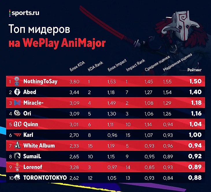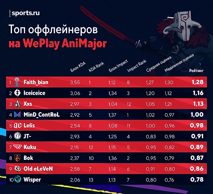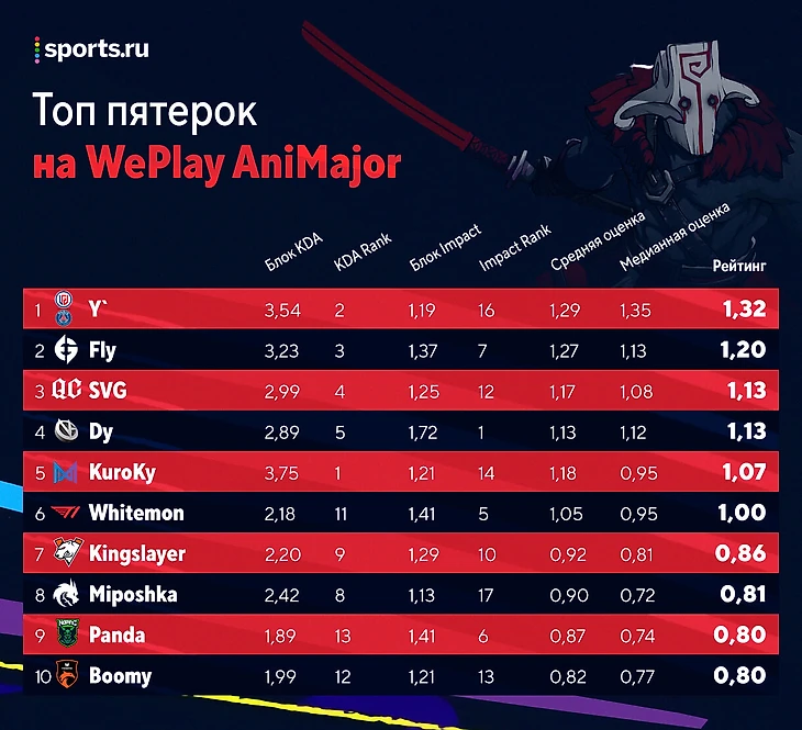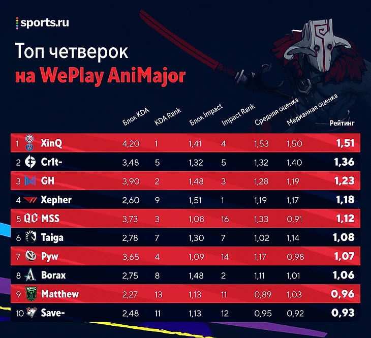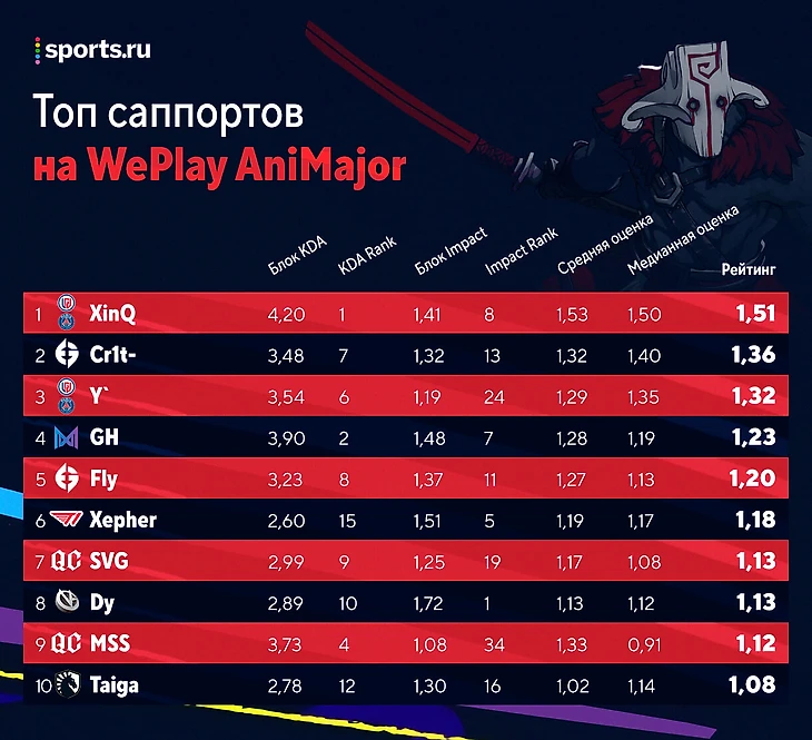 ★ PSG.LGD – вне конкуренции на киевском мейджоре. Шесть первых строчек: четыре – в таблицах по ролям, еще по одной – в списке саппортов и в общем топе. Исключением стал Ame – №2 среди керри. Но и он сыграл очень круто и прошел в пятерку лучших на турнире. По сумме рейтингов команда Xiao8 с 7,00 уверенно обошла всех на WePlay AniMajor: у EG – 6,49, у остальных – максимум 5,69. Страшно представить форму PSG.LGD на Инте, если, по словам их оффлейнера, сейчас уровень готовности к TI равен нулю.