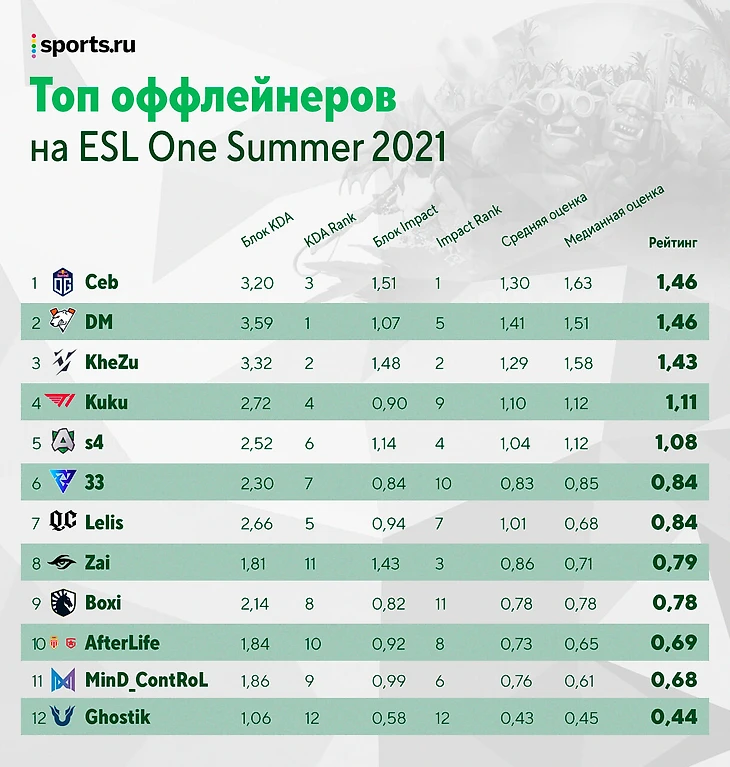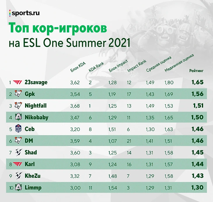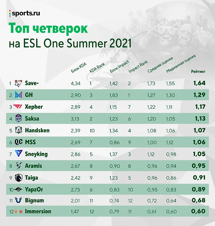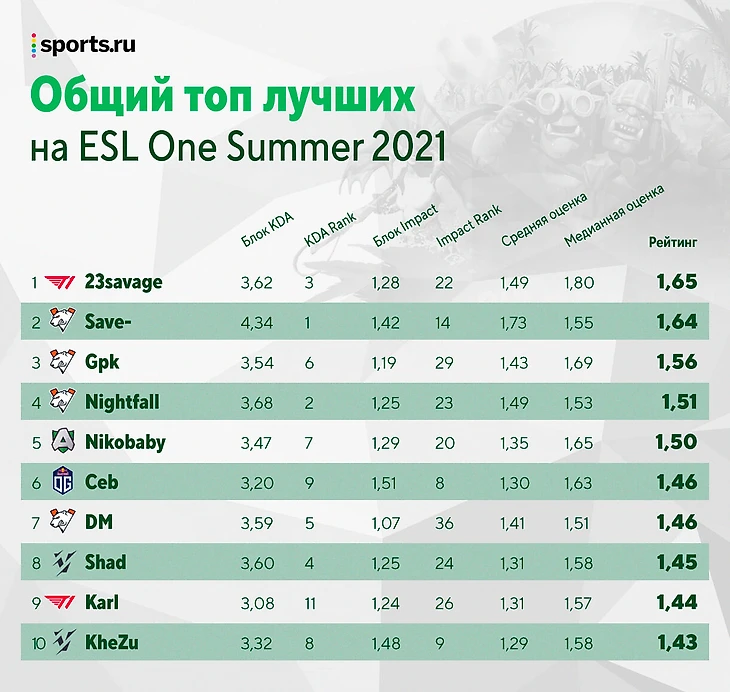 Рейтинг ESL One Summer 2021: Сейв – лучший саппорт, Дрим – худший керри, Фнг – в топ-3 пятерок