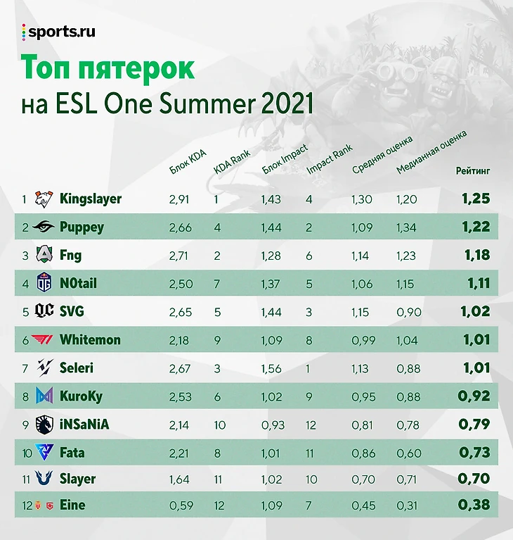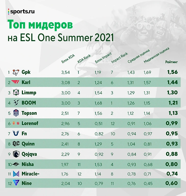 ★ Приятно удивила Alliance. После позора в Киеве далеко не все ожидали хорошего выступления от команды Лоды, но топ-3 – достойный результат. Вернулся старый Nikobaby, в шаге от десятки лучших остановился Limmp, а главное – очень круто сыграл Fng. Артем вошел в топ-5 саппортов и стал 16-м в общем рейтинге. Именно за счет прогресса Нико, Лиммпа и Фнг команде удалось зайти так далеко. Handsken и s4 пока проседают: среди всех игроков саппорт Alliance – 24-й, а капитан – 23-й. Тем не менее, сумма рейтингов 6,14 отражает мини-ренессанс Alliance и заслуженность 3-го места.