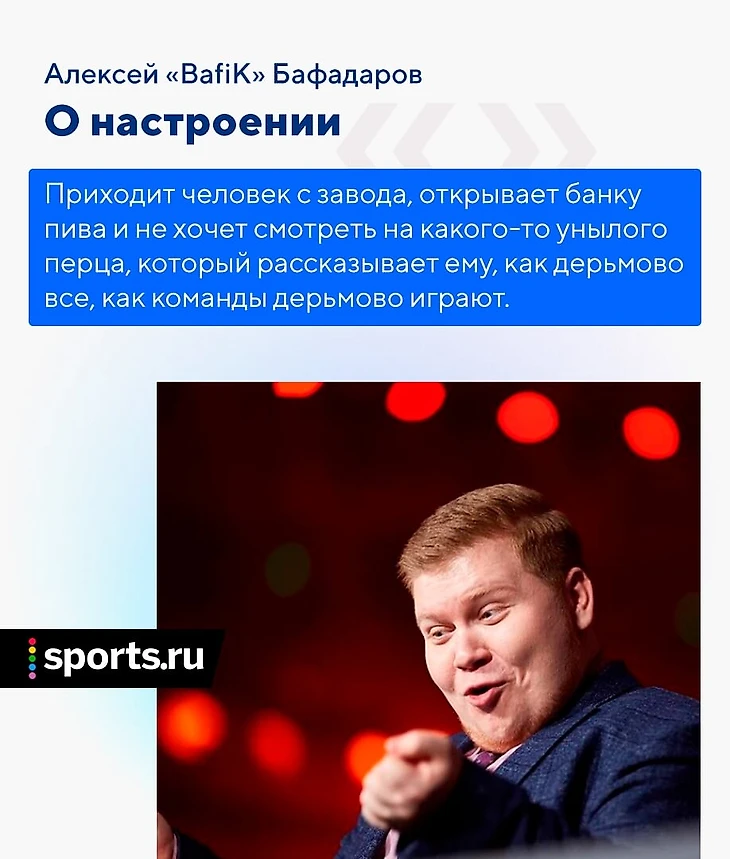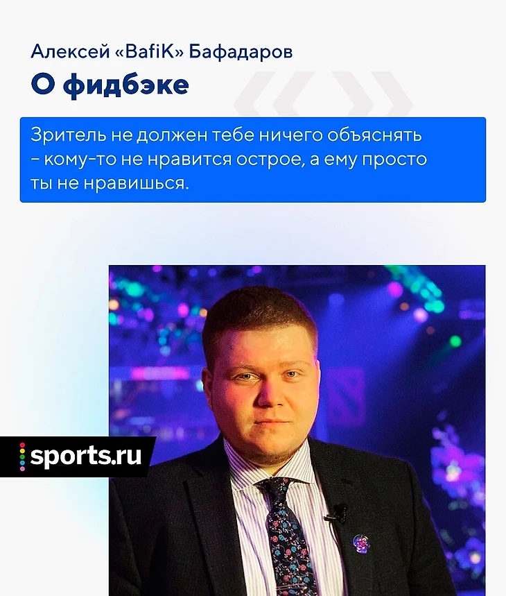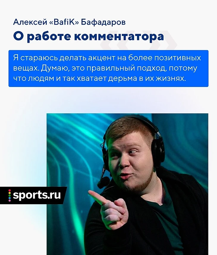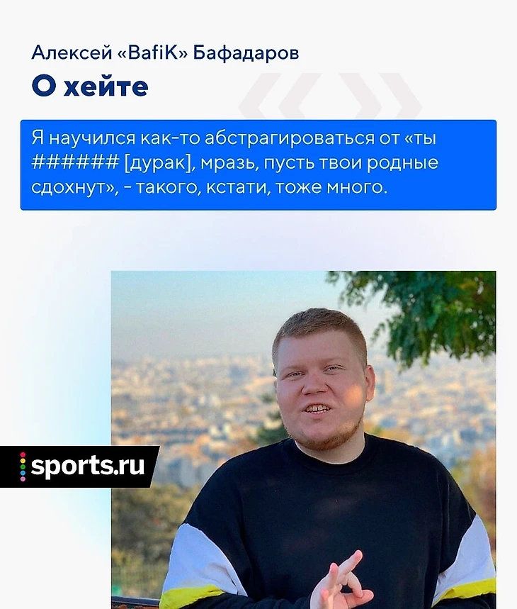 Хейта очень много, я научился как-то абстрагироваться от «ты ###### [дурак], мразь, пусть твои родные сдохнут», – такого, кстати, тоже много бывает и это особенно печально. Но вот недавно Вилат написал какой-то пост, и человек под ним ответил что-то вроде: «пожалуйста, скажите Бафику, чтобы не анализировал, а шел комментировать, потому что в аналитике он смотрится нелепо на фоне про-игроков». И я ему пишу: «пожалуйста, уточни, какие моменты тебе не понравились». Какой-то конкретики жесткой я не получил, он просто указал на моменты, которые ему не понравились, я его понял. Просто этот человек имеет такое мнение, и когда он мне его расписал, я сказал: «ок, принял, интересное мнение, я подумаю над этим». Он дает мне какую-то пищу для размышлений, мне уже есть от чего оттолкнуться.