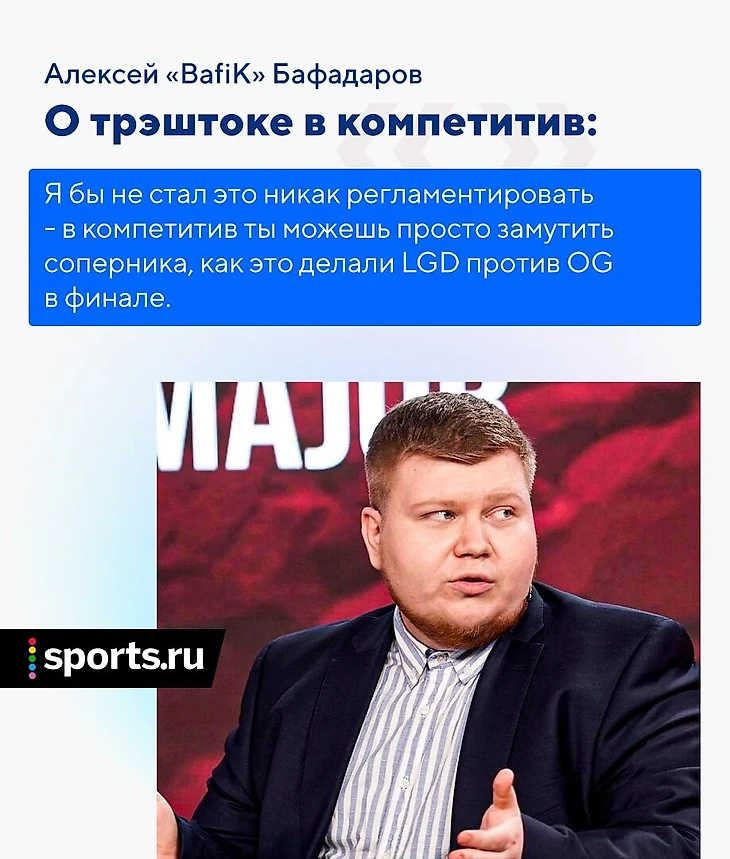 Запрещать бы я это не стал – это должно быть негласным правилом. Если ты его нарушил, то жди реакции от сообщества. Тут уж как кто воспримет, потому что и в футболе, и в боксе такие примеры бывали – ребята нарушают правила Fair Play, и к ним по-разному относятся. Иногда считают, что это некрасиво, чрезмерно, а другого воспримут с улыбкой. Я бы не стал это никак регламентировать – в компетитив ты можешь просто замутить соперника, как это делали LGD против OG в финале.