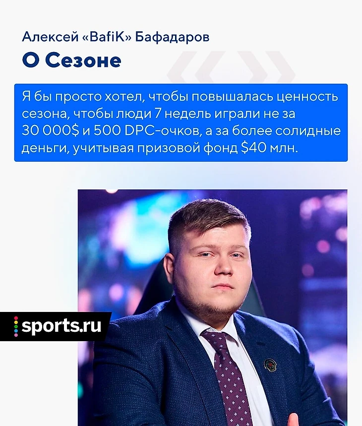 Я бы просто хотел, чтобы повышалась ценность сезона, чтобы люди 7 недель играли не за 30 000$ и 500 DPC-очков, а за более солидные деньги, учитывая призовой фонд $40 млн. Зачем гоняться за этими рекордами, когда все уже и так поняли, что вы молодцы, вы – топ. Можно просто выделять процент с этого сбора на сезон, чтобы сделать их более значимым и для команд, и для зрителей.