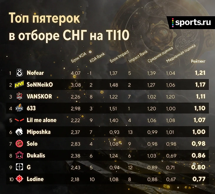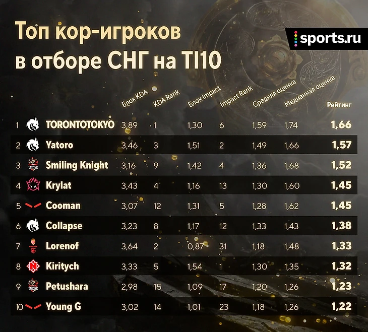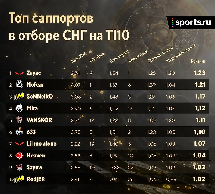 Рейтинг отбора СНГ на TI10: TorontoTokyo – MVP, Zayac – лучший саппорт, Ramzes666 ниже LastHero