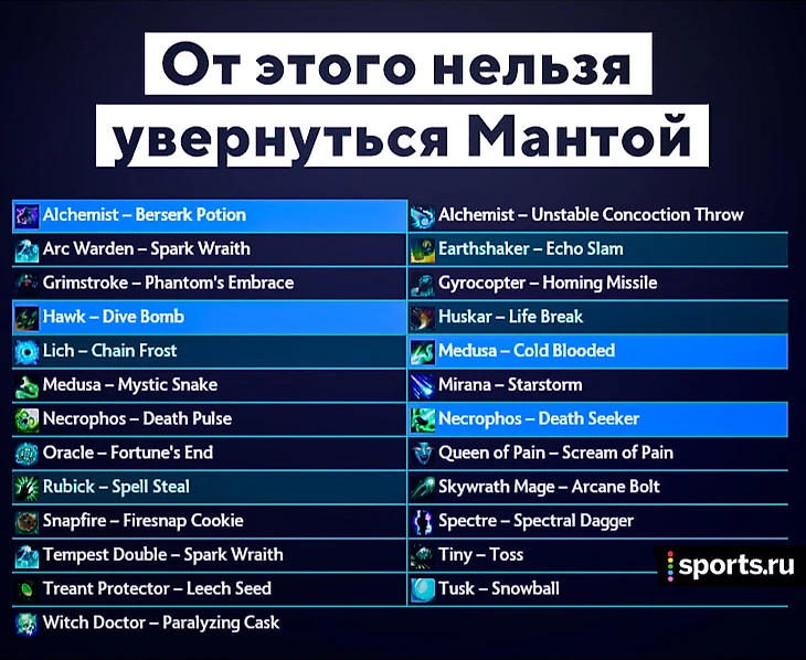 Важно: от некоторых из этих спеллов (например, каски ВД, Чайника Лича, банки Алхимика) все равно можно увернуться. Но для этого нужно нажать Манту в момент, когда спелл уже почти прилетел в вашего героя. Технически герой пропадет с карты на 0,1 секунду – и если спелл должен был прилететь именно в это время, получится Манта-додж.