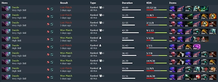 Несмотря на неплохой результат (50% - не у каждого героя на своей роли есть такой процент побед!), я не до конца доволен итогом. Дело в том, что у Даззла-керри очень много требований к драфту: