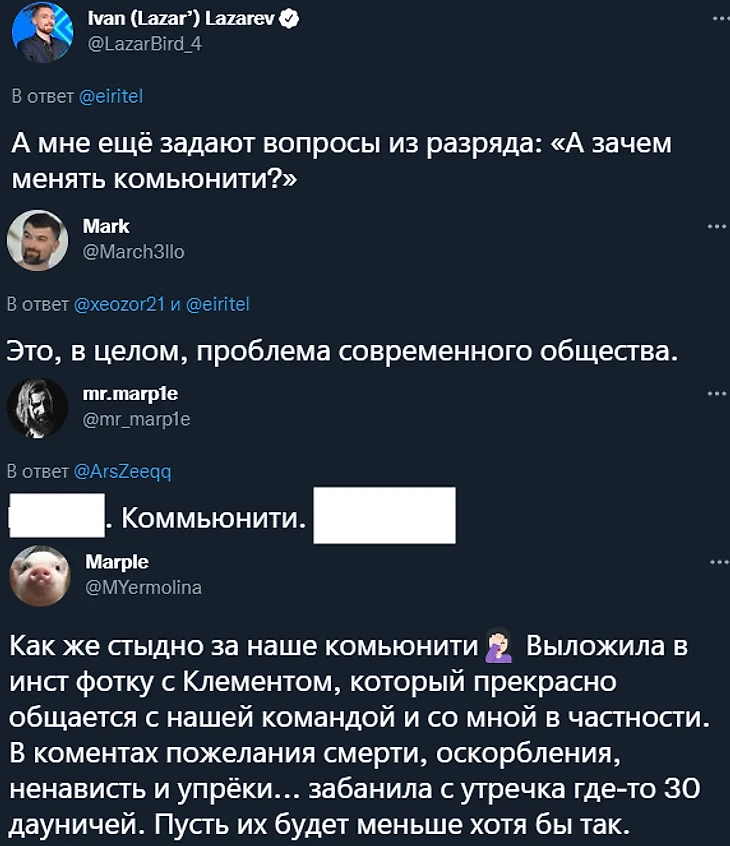 Очень удобно всегда винить комьюнити и СНГ менталитет во всех бедах. Когда-нибудь сильные мира сего начнут замечать, что проблема в них, а не в комьюнити. Если ты хочешь поменять комьюнити, то лучше всего сделать это действиями, а не сообщениями в Твиттере. Менеджменту организаций, медийным лицам, игрокам, студиям и турнирным организатором давно пора научиться слушать и слышать тех, благодаря кому они могут жить хорошо и заниматься любимым делом. Без нас вас просто бы не существовало.