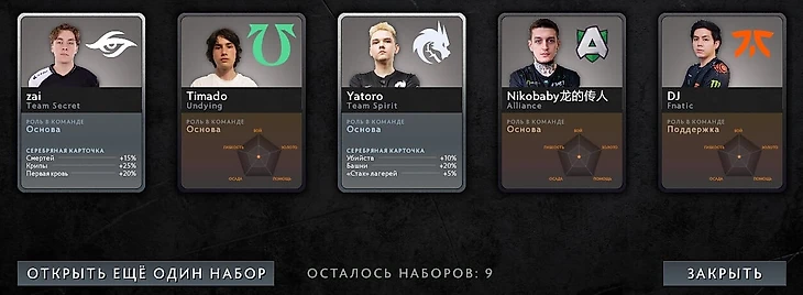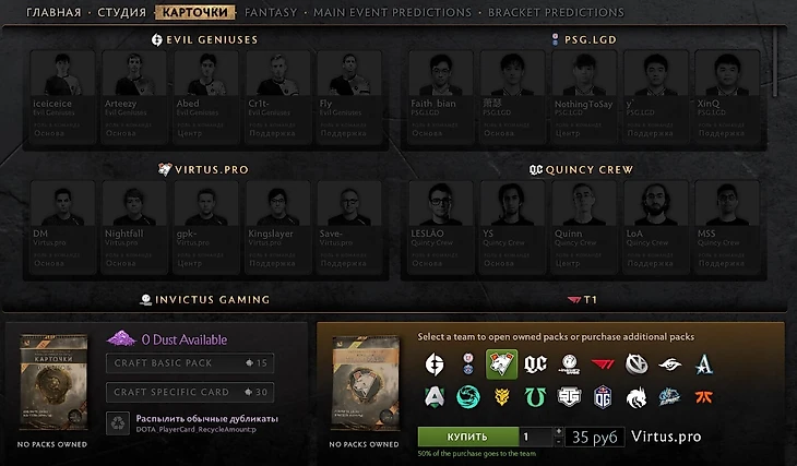 Что же до самого фэнтези – пока оно недоступно. Впрочем, с учетом отсутствия изменений в механике карточек игроков, система не должна отличаться от аналогичной на TI9: