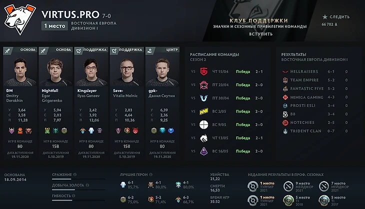 На иконку можно нажать – это перебросит вас на профиль команды, где можно посмотреть: результаты игр, популярных героев, стату по КДА, а также историю выступлений клуба на The International. Главный минус – стата только по DPC-лигам: