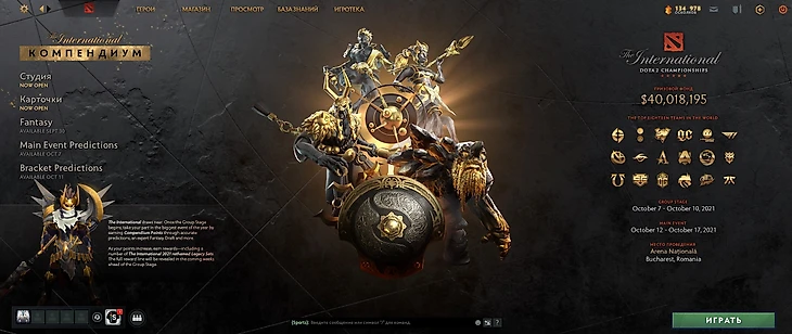 Для начала – это именно Компендиум, а не Боевой Пропуск в его современном виде. То есть никакой прокачки уровней с потенциальными наградами в виде шмоток и таунтов в привычном виде, никаких катакомб, но вот карточки игроков, фэнтези и предикты на месте. А первым в новом Компендиуме нас встречает достаточно красивый экран с Аегисом с черно-золотом стиле: