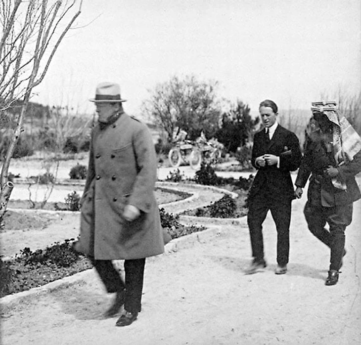 Слева направо: Черчилль, Лоуренс и Абдалла в Иерусалиме, март 1921 года.