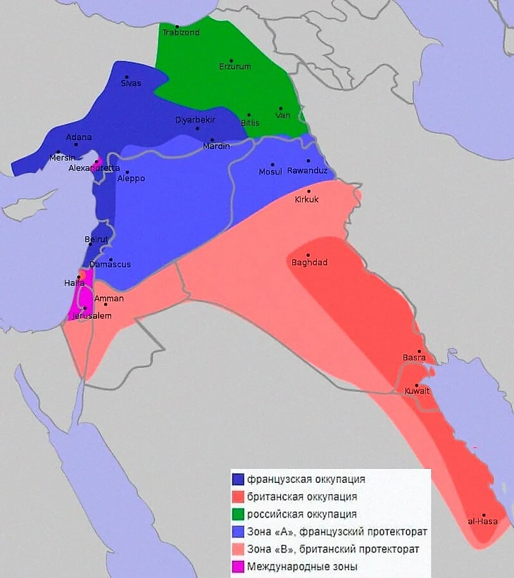 Зачем это все Британии? Раньше Аравийский полуостров считался просто кучей бесполезного песка, но потом там обнаружили нефть. Много нефти, даже очень. И, конечно, английская корона подготовилась ко всему заранее – по соглашению Сайкса-Пико от мая 1916 Ближний Восток был заранее поделен на зоны влияния между Великобританией, Францией и Российской империей, а позже и Италией. Никто не собирался дарить арабам независимость – лишь небольшая территория между рекой Иордан и Средиземным морем должна была находиться под международным контролем после войны.