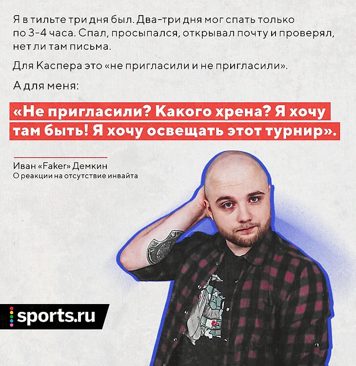 Я понимаю, что Valve не обязаны ничего объяснять. Мне никто ничего не должен. Меня не позвали – и это их полное право. Но было бы очень прикольно и полезно, чтобы мне сказали: «мы не позвали вас по вот этой причине». Ведь нельзя же звать 6 лет подряд, а на 7-й не позвать просто так. Какие-то же причины должны быть. Я вроде никуда не уходил, не пропадал на целый год. И если бы мне сказали: «следите за своим языком вне эфира» – я бы понял, что я слишком много себе позволяю. Или «как-то в этом сезоне не чувствовалось искры в твоих глазах, верни себе мотивацию» – я буду работать над этим.