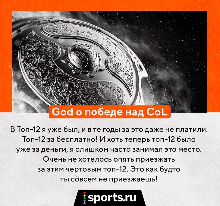 «К нам подходит судья и спрашивает: «Кого выбираете: Fnatic или NAVI?», – рассказывает DrAmer. – И Серега отвечает: «Точно Fnatic». Ему начинают доказывать, что NAVI слабее и будут проще в качестве соперника в bo1. И God произносит фразу, которую я помню до сих пор: «Если я просру bo1 на вылет Fnatic, я переживу это. Если я проиграю NAVI, то я себе этого не прощу».