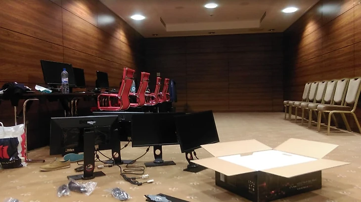 Возможно, это был один из самых роскошных буткемпов The International 5. Антону Черепенникову удалось выбить неплохую скидку, чтобы разместить дотеров в шестизвездочном (да, именно так) отеле «Украина». Игроки жили в самых комфортабельных номерах, завтракали в ресторане гостиницы, а их тренировочная комната располагалась в конференц-зале где-то между салоном «Майбаха» и дорогущим мясным рестораном, который охраняли ФСОшники размером в три стандартных дотера. Каждый день пять вполне стандартных дотеров проходили мимо них по стеклянно-мраморным коридорам и, громко обсуждая игры, рассаживались в отделанном деревом зале.
