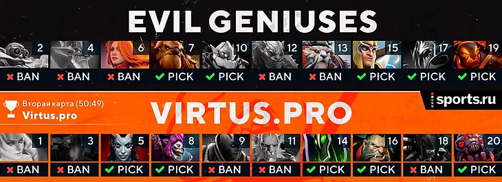 Первая демонстрация смертоносного оружия прошла успешно. Evil Geniuses еще на драфте не ожидали увидеть против себя Бруду и поэтому не имели ответов на постоянный пуш. 50 минут VP раскачивала соперников по карте и играла в ту самую противную Доту.