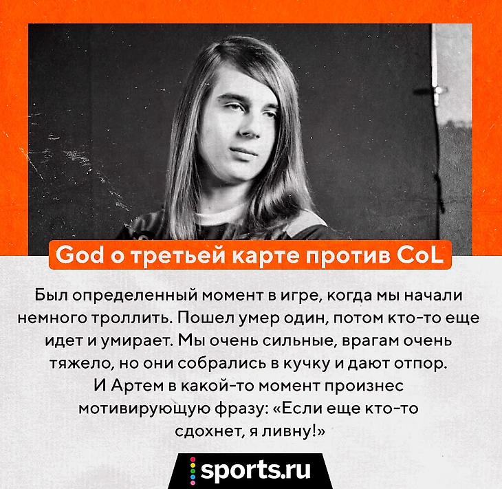 «Мы в первой карте должны были их без шансов стирать. Но в один момент, довольно глупый в игре, сильно сломал нам темп, – вспоминает God. – Мы собрались единым кулаком в пуш. И я очень сильно настаивал дефать сторону, не давать им разменяться. Так вышло, что у Лила не было телепорта, но я очень сильно зафорсировал события, и мы подрались 4 на 5. И с этого начался камбэк CoL в игре. Решения стали хуже, кнопки стали хуже нажиматься. Эмоционально на нас очень сильно сказалось то, что нас тогда вайпнули».