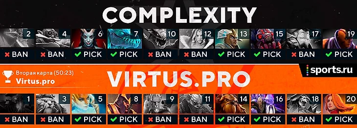 И они ее проиграли. Через 25 минут медленного камбэка CoL разрушила вражескую базу и немного пошатнула уверенность в себе некоторых игроков VP. В кабинку после перерыва они возвращались более молчаливыми и сосредоточенными. Драфт вернулся в прежнее русло, эксперименты с Разорами закончились. В ход пошли вымуштрованные Сайленсер и Лина – лучшие герои команды, которыми вместе играли только ребята из VP.