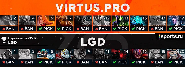 LGD была соперником, с которым VP сыграла огромное количество тренировочных матчей. Китайцы прекрасно знали, что будут делать «медведи» на каждом этапе: от драфта до передвижений по игре. VP оказалась в невыгодном положении еще во время пика – Fng планировал взять на последний пик Chaos Knight, но xiao8 отправил его в бан. Больше рабочих идей у команды не было.