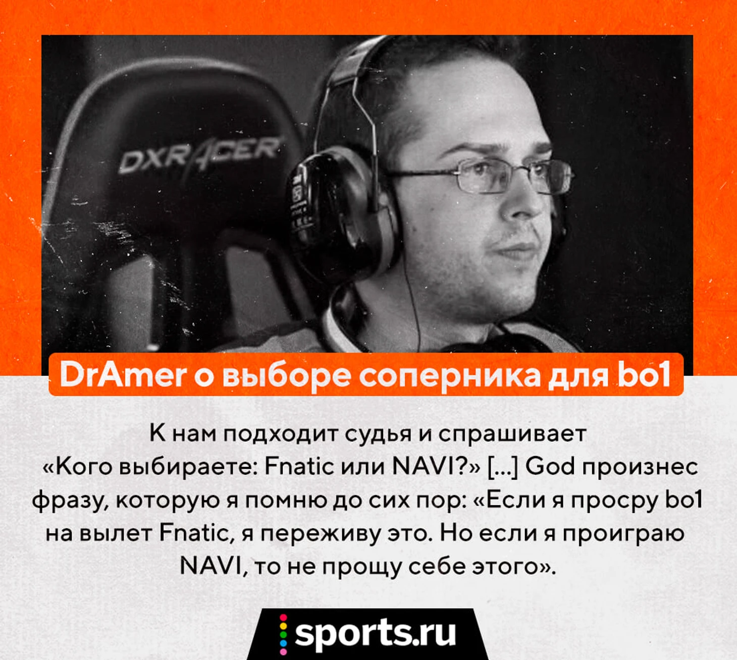 «К нам подходит судья и спрашивает: «Кого выбираете: Fnatic или NAVI?», – рассказывает DrAmer. – И Серега отвечает: «Точно Fnatic». Ему начинают доказывать, что NAVI слабее и будут проще в качестве соперника в bo1. И God произносит фразу, которую я помню до сих пор: «Если я просру bo1 на вылет Fnatic, я переживу это. Если я проиграю NAVI, то я себе этого не прощу».