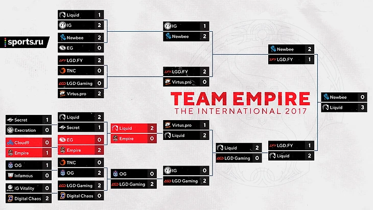 За групповую стадию квалификации Team Empire проиграла всего две карты. Без проблем вышла в плей-офф и даже сбросила в нижнюю сетку Team Spirit в первом раунде. На пути к The International они застопорились один раз – во второй карте против Vega Squadron. Застопорились ровно на 140 минут.