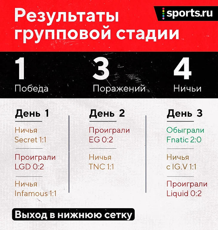 Имперцы относились к играм группового этапа как к тренировкам. Пробовали стратегии, подбирали подходящих героев. После неожиданной победы над Team Secret в первый день им удалось выиграть только одну карту, и ту у Infamous. И при этом ребята не теряли боевого настроя.