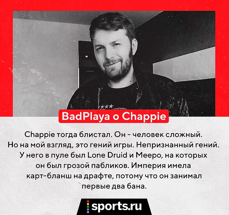 «Chappie тогда блистал, – вспоминает Игорь «BadPlaya» Горевой. – Он – человек сложный. Но на мой взгляд, это гений игры. Непризнанный гений. Тогда это был его первый большой соревновательный опыт. У него в пуле был Lone Druid и Meepo, на которых он был грозой пабликов. Империя имела карт-бланш на драфте, потому что он занимал первые два бана. Это развязало руки команде – можно было драфтить, как хочется».