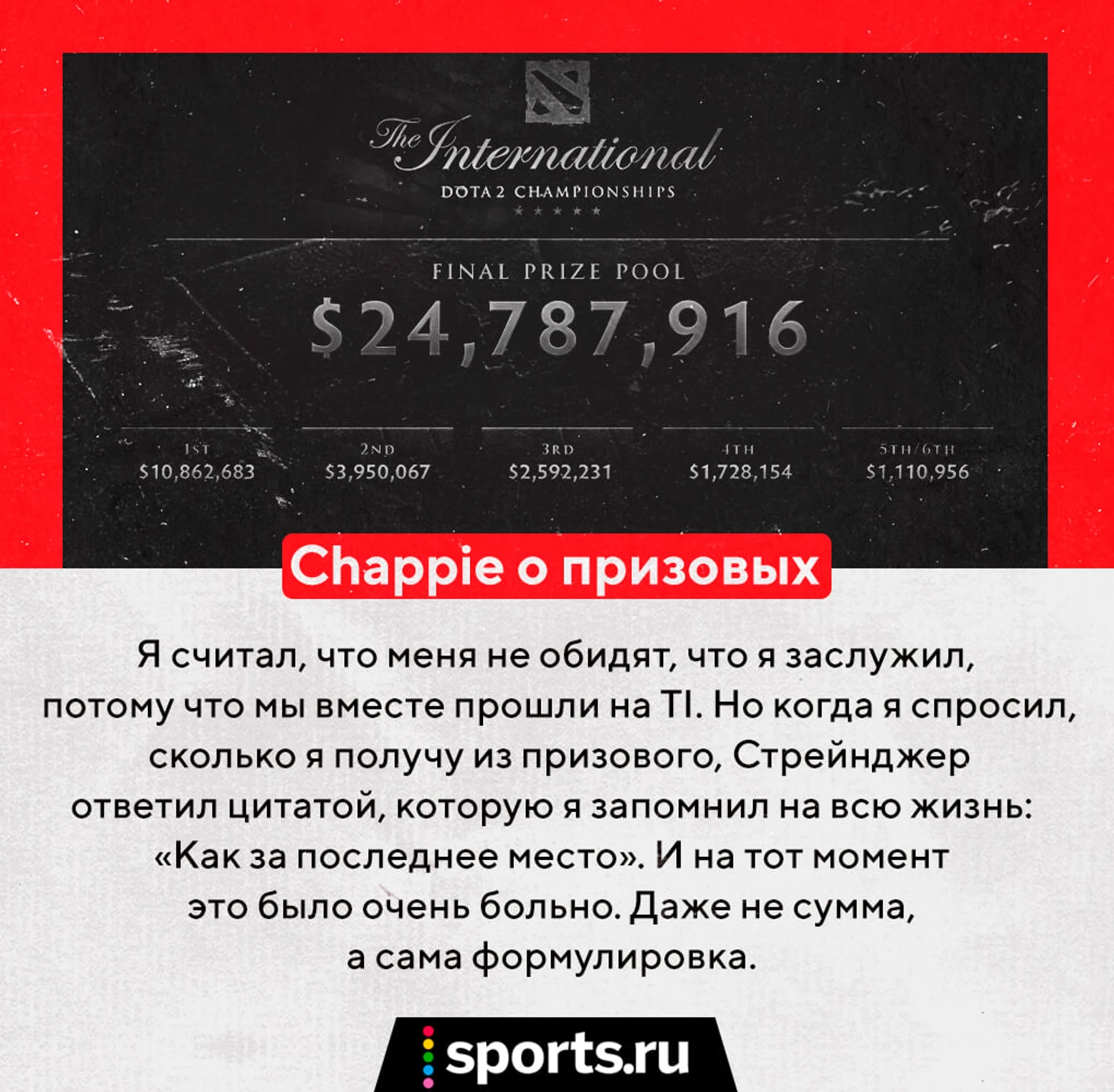 Этот TI был достаточно тяжелый во всех сторонних аспектах. Сейчас вспоминаешь и понимаешь, что все можно было сделать... Нормально. Можно было избежать проблем с призовыми для Чаппи, можно было избежать каких-то конфликтов внутри состава. Но получилось как получилось».