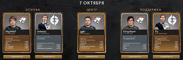 Если у вас в «золоте» есть только один из них, то лучше поставьте эту карточку – если не произойдет какого-то сильного провала, то такой выбор окупить себя за счет бонусов. Если же выбирать между тремя равноценными карточками, то он де-факто сводится к выбору между парами «Abed-Gpk» и «Abed-Topson». Я бы все же отдал предпочтение мидеру VP или Топсону – их лайнапы в центры в этот день выглядят как-то проще (да и Undying, TP и Alliance слабее Aster, IG и T1). В состав я по итогу взял Gpk.