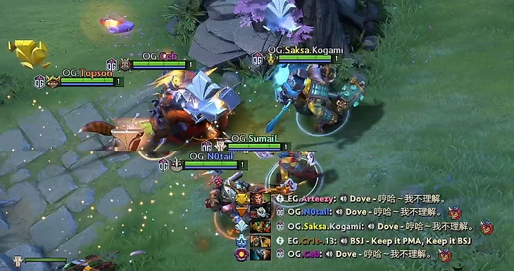 В матче между EG и OG в третий игровой день The International 2021 известные мастера чата применили новый вид психологического давления. Нотейл, Себ и Сакса спамили фразу китайской кастерши Dove, девушки Артизи. Видимо, так игроки OG отвлечь Артура от Доты. Голос любимой должен был перестроить мозг керри EG с крипов на обнимашки, а спортивную злость превратить в романтическую расслабленность.