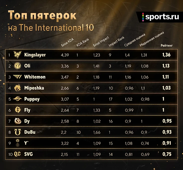 Игроки получают оценки за каждую карту на основе того, насколько они превзошли средние значения для героев в паблике от 5000 MMR. Например, если дотер делает в 2 раза больше фрагов на мидовой Лине, чем средняя Лина в центре за это же время в паблике от 5000 MMR, то его показатель киллов считаем равным 2. По итогам карты мы берем все показатели игрока, подставляем их в формулу и получаем оценку – числовое отображение качества игры. У саппортов и коров формулы отличаются. По итогам турнира для каждого игрока берутся среднее значение всех оценок, а также их медиана. Среднее из двух этих чисел = рейтинг игрока за чемпионат.