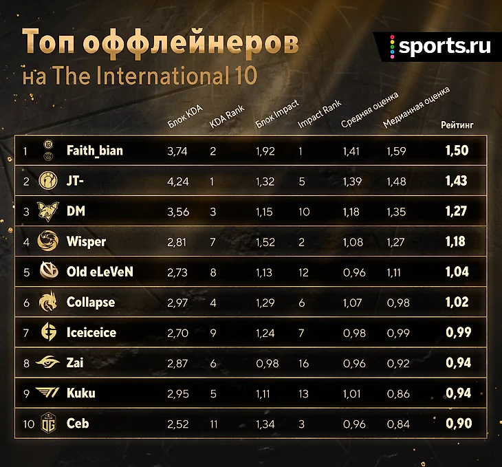 ★ У Spirit также все здорово. Крутую форму набрал Yatoro, а TorontoTokyo вышел на второе место по KDA за карту. Только у Flyfly цифры лучше, чем у TT: 9,04 против 8,64. В целом TorontoTokyo и Collapse вошли в топ-20 кор-игроков Инта по рейтингу: мидер Spirit – 18-й, оффлейнер – 20-й.
