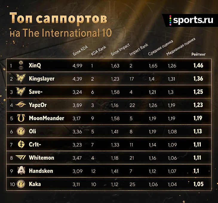 Все в порядке и у саппортов. Mira – третий по KDA среди четверок и 13-й по рейтингу среди сапов. Miposhka остановился в шаге от топ-10 – позиция №11 в таблице саппортов. У Spirit не такие крутые показатели, как у VP, но команда хороша – у нее будут шансы против IG.