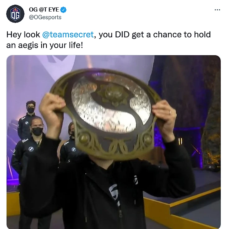 OG – Secret играли в верхней сетке вторыми, так что в твиттере у команд было время на развлечения. Ход OG – подколы во время церемонии открытия.