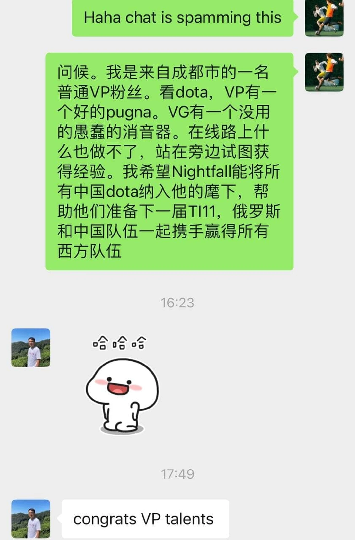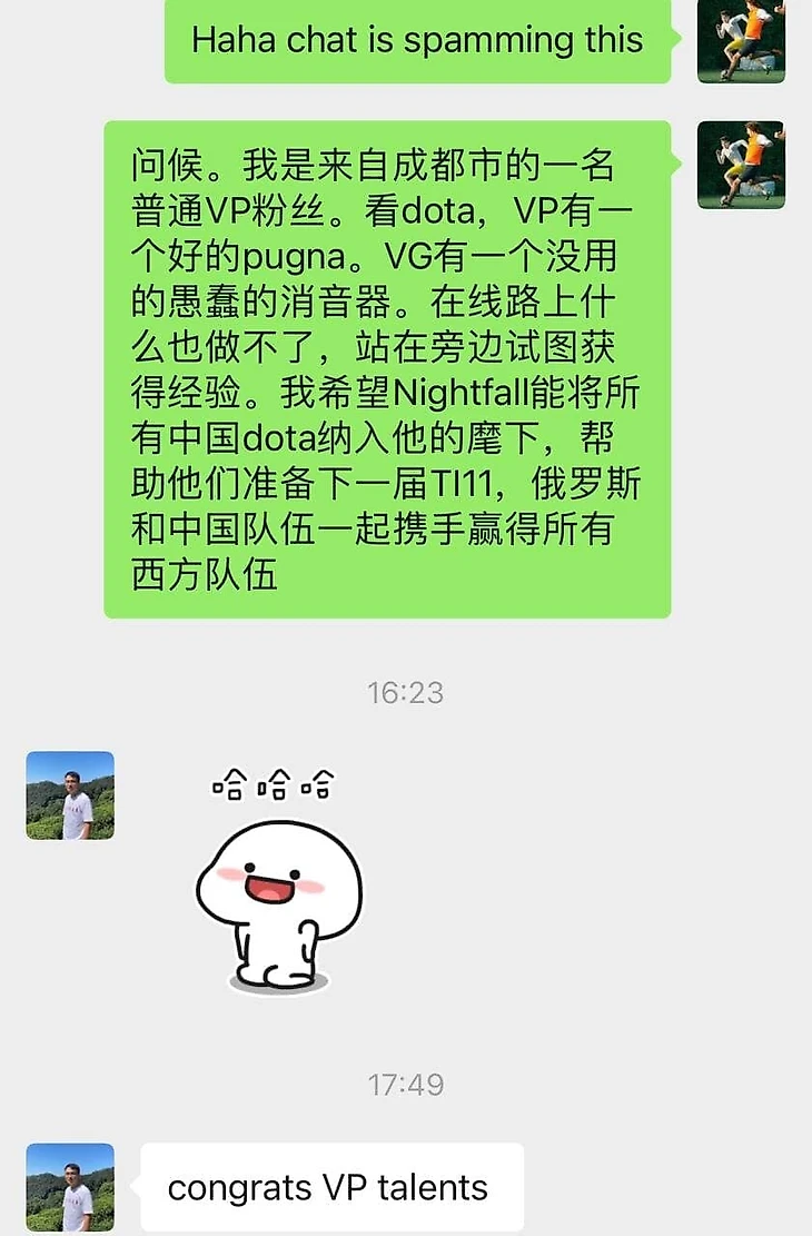 Перевод: «Привет, я простой фан VP из Чэнду. Смотрю Доту, у VP хорошая Пугна. А у VG бесполезный, придурковатый Сайленсер, который стоит и стилит экспу. Надеюсь, Найтфолл сможет собрать всех китайских дотеров под своим командованием и поможет им подготовиться к TI 11. Русские и китайцы будут работать вместе, чтобы выиграть у всех западных команд».
