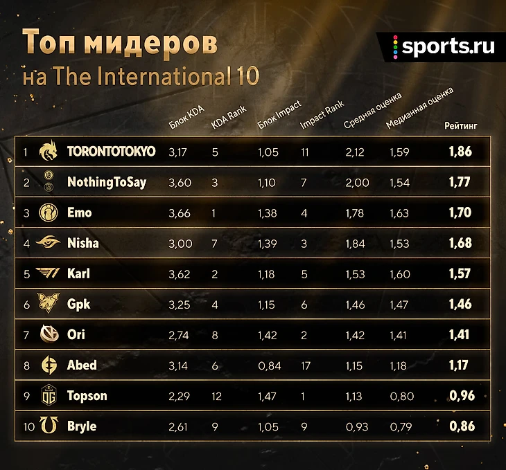 ● TorontoTokyo – лидер топа мидеров и еще один герой региона. Но у TT еще больше слабых карт, чем у Yatoro (10), и довольно слабо отыгранная групповая стадия – на рейтинг 1,09. В плей-офф Торонто раскрылся, но догнать топ-4, включая суперстабильного Аме (всего 3 плохих карты за Инт), с таким отставанием почти невозможно.