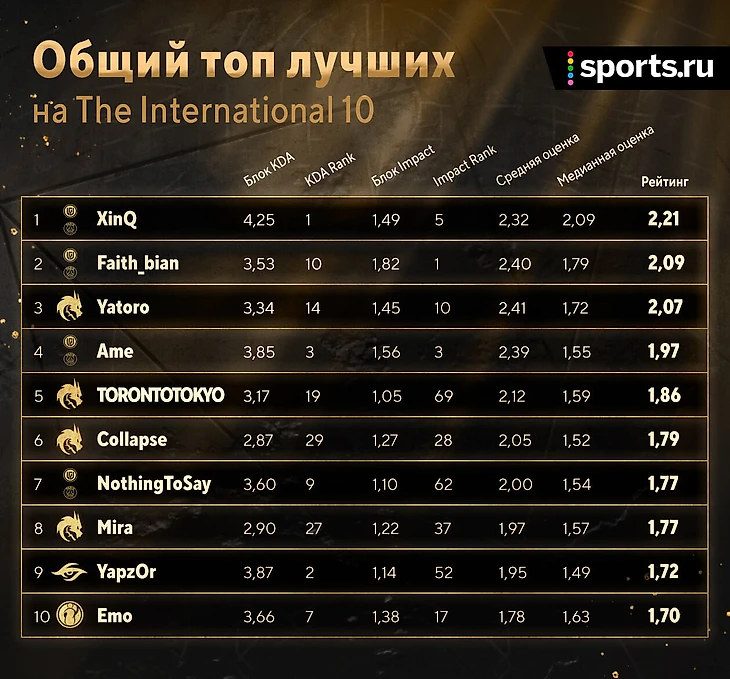 Официальная награда MVP на The International не вручается. По рейтингу Sports.ru лучшим игроком TI 10 признан XinQ из PSG.LGD. В топ-3 также вошли Faith_bian (PSG.LGD) и Yatoro (Team Spirit).