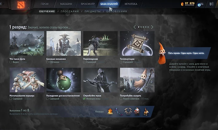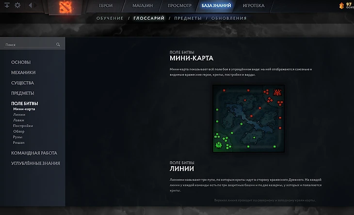 Чтобы пройти обучение в Dota 2, перейдите во вкладку База знаний. Внутри небольшие задания, которые познакомят вас с основными механиками игры.