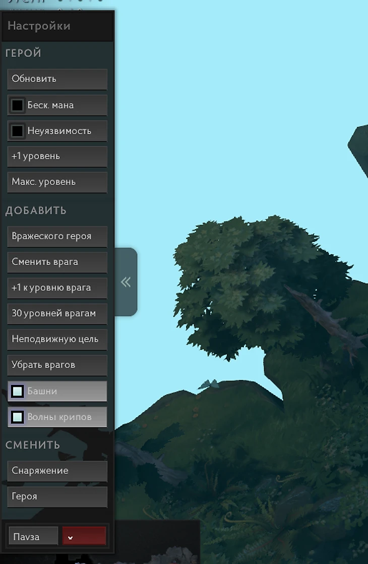 Вы окажетесь в специальном лобби с бесконечным золотом, в котором можно активировать самые разные настройки. Например, включить или добавить ботов-болванчиков. Самое то для того, чтобы познакомиться со скиллами героя и самыми разными комбинациями.